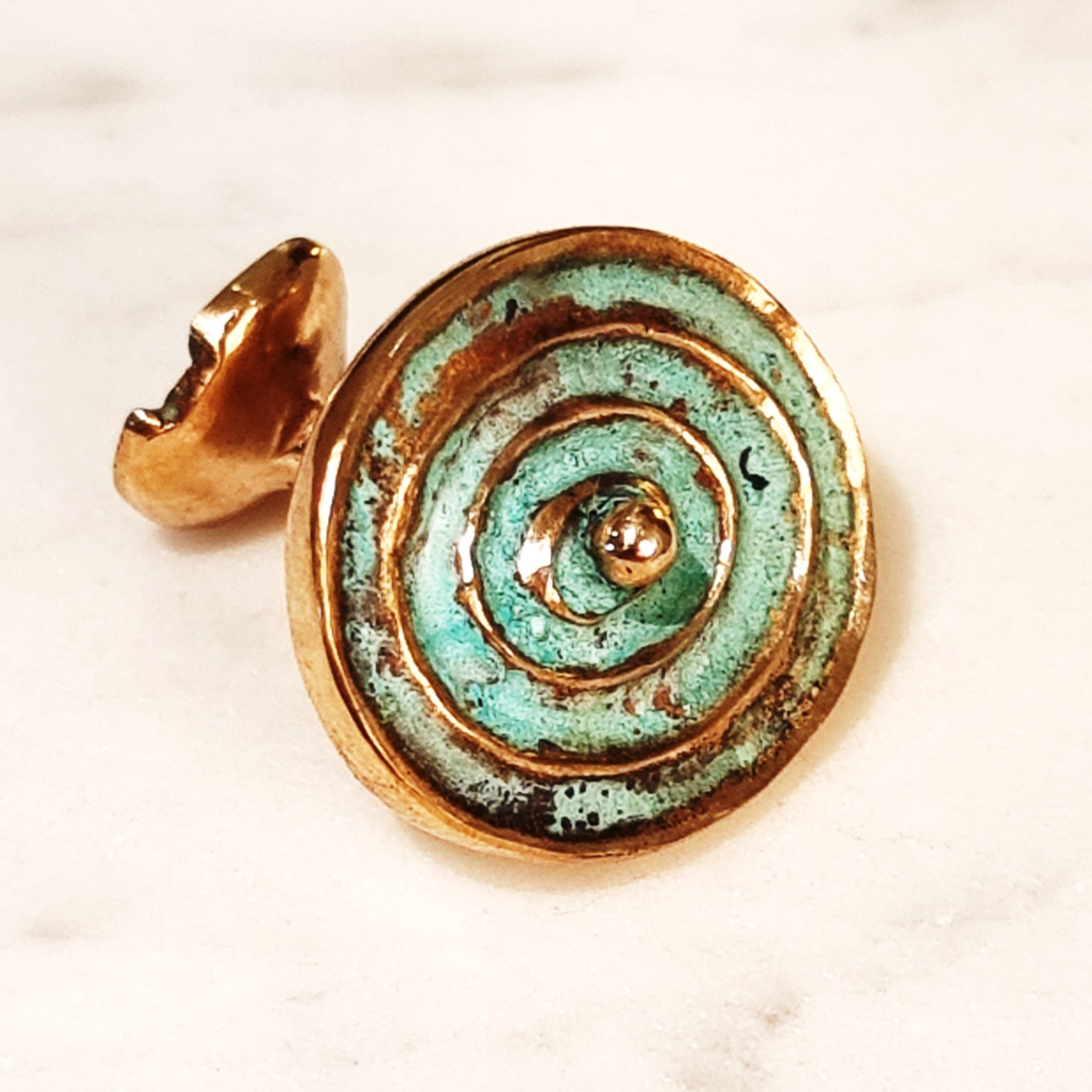 Large, round bronze cufflinks with blue/green patination.